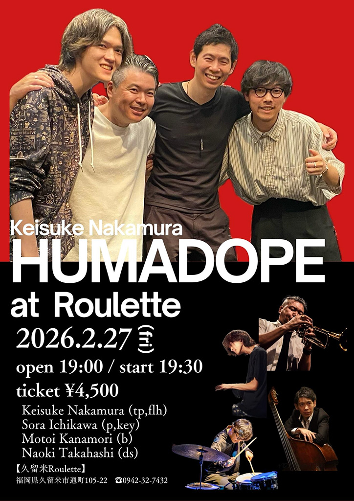Keisuke Nakamura (Tp, Flh), Sora Ichikawa (Pf, Key), Motoi Kanamori (Ba), Naoki Takahashi (Drs)Open 19:00 Start 19:30料金:4,500円